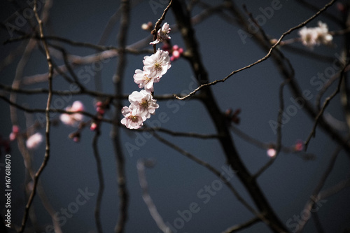 Cherry Blossom Flowers With Blurred Background In Dark Vintage