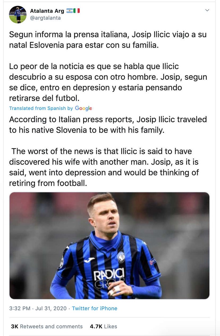 Atalanta Forward Josip Ilicic Caught His Wife Cheating Considers